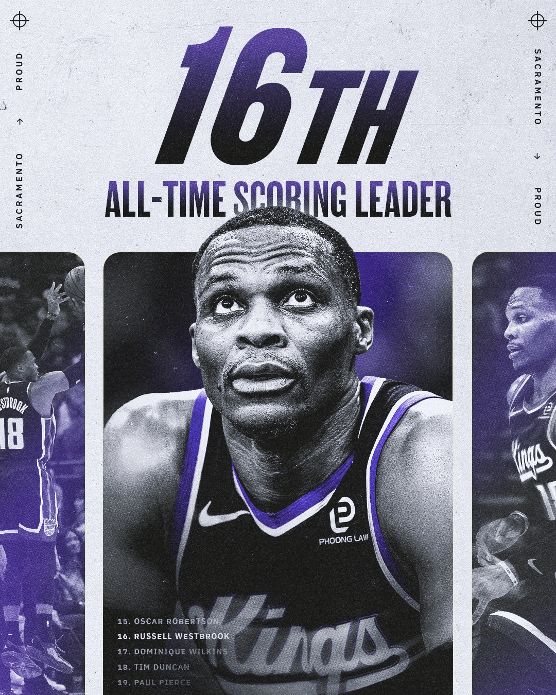 国王官方分享海报:威少生涯得到26670分,超越多米尼克-威尔金斯(26668分)升至历史第十六位,距离奥斯卡-罗伯特森(26710分)还差40分。